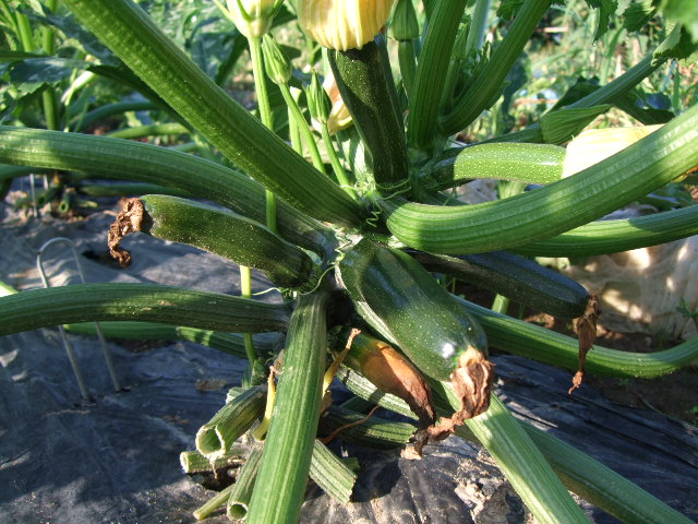 2016-06-24 ズッキーニ 生育状況 ズッキーニ ズッキーニはここまで順調に収穫してきたがよく見ると未熟果もちらほら やはり人工授粉してあげないといけないのか たまに実に穴が空いてるのは虫が食ったんだろうか いろいろ謎